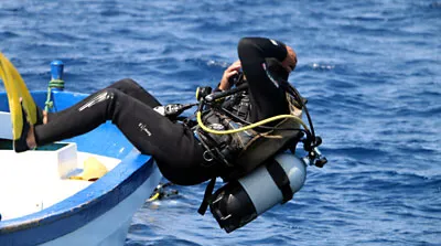 La mise à l’eau en arrière se fait en s’asseyant sur le bord du bateau, équipement vérifié et gilet légèrement gonflé. Le plongeur tient son masque et son détendeur, bascule en arrière et entre doucement dans l’eau. Une fois à la surface, il fait le signe “OK”, rejoint le groupe et commence la descente.